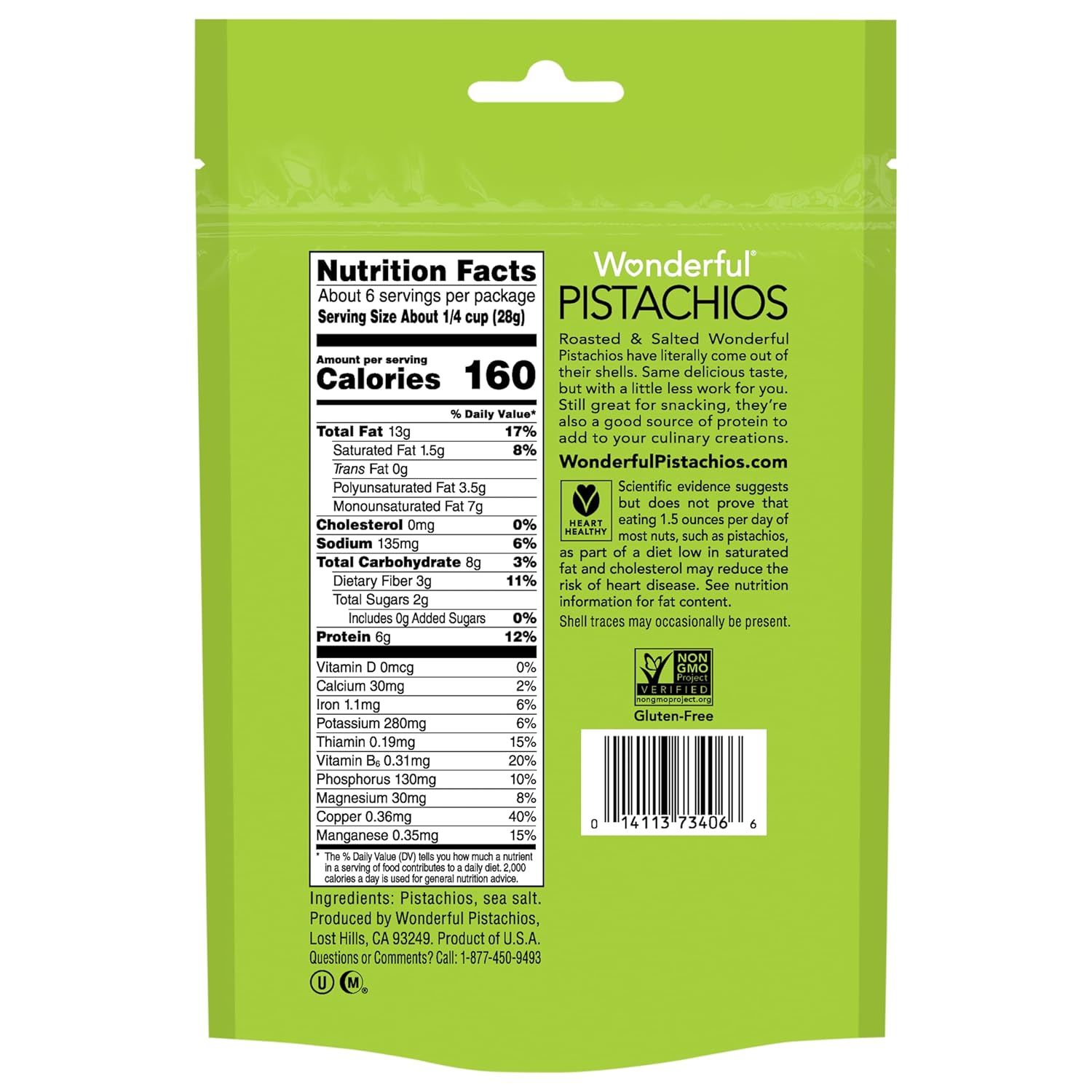 크기: 순중량 6온스(170g) 쉘 없음 – 그레이트 피스타치오 6온스 가방은 집에서나 이동 중에 휴대하기에 좋습니다. 재밀봉 가능한 봉지가 특징인 이 건강 간식은 식료품 저장실의 필수품입니다. 지방 함량에 대한 영양 정보를 참조하세요.